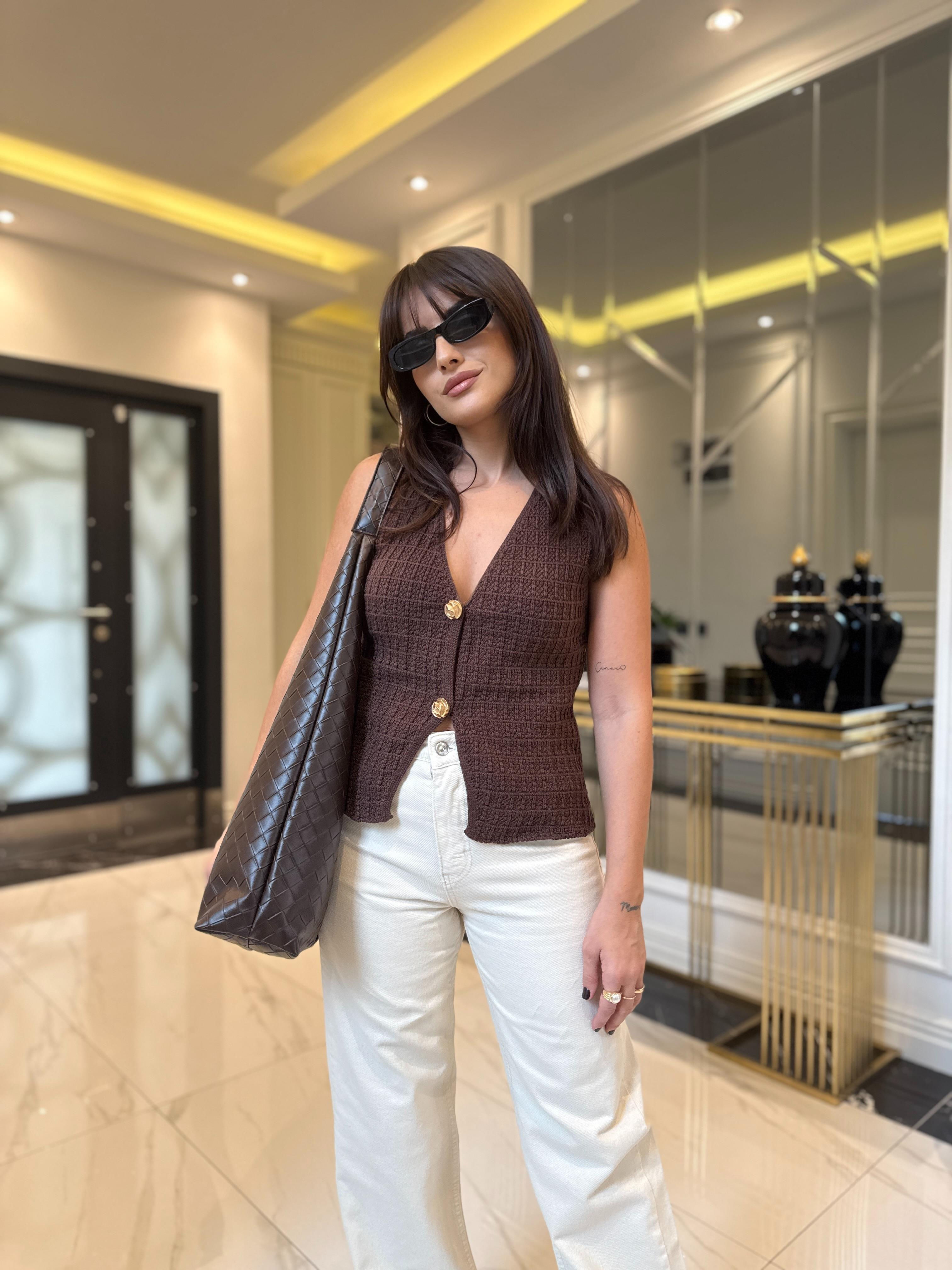 Kahve Gold Düğmeli Örgü Yelek