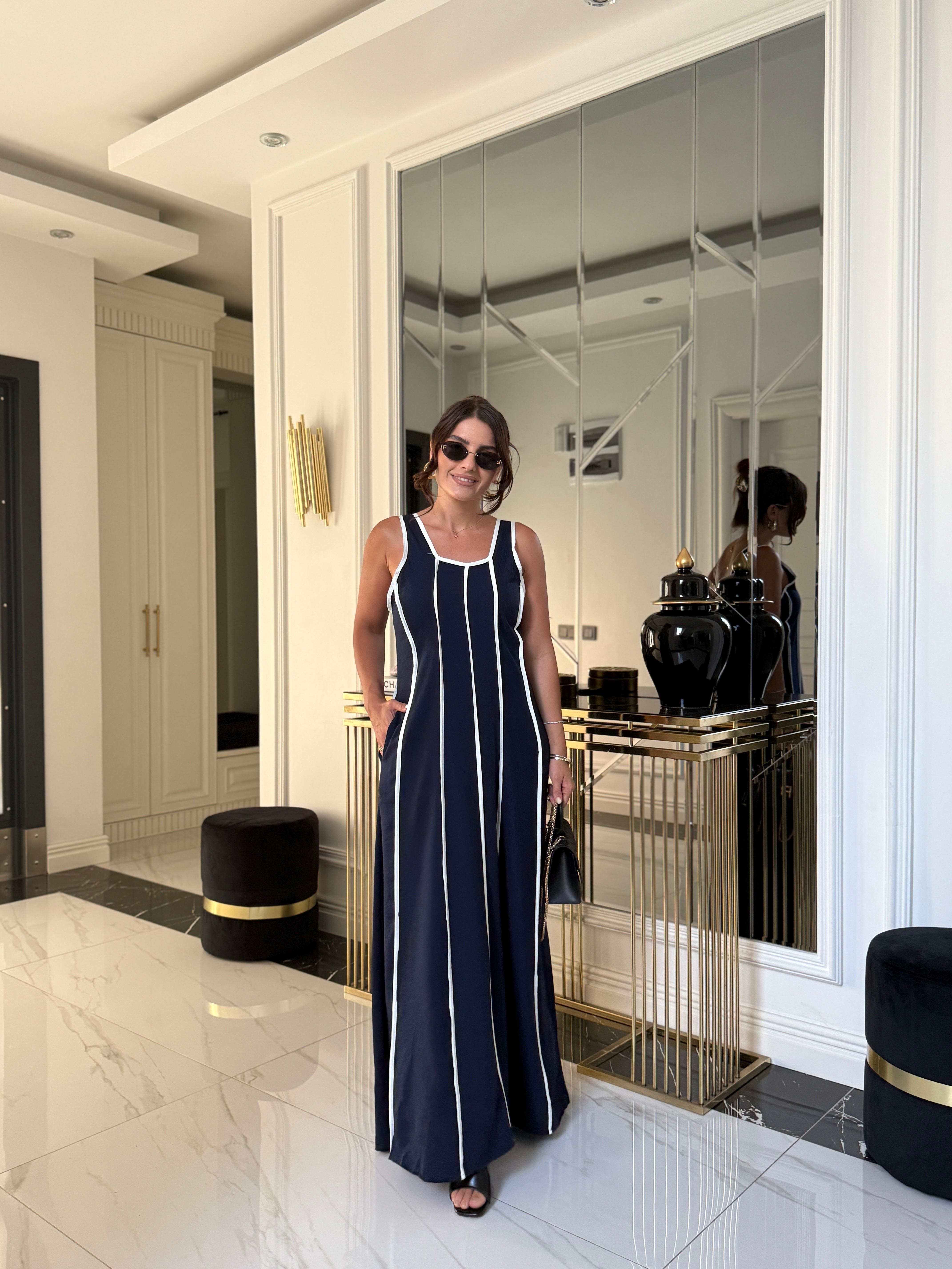 Lacivert Biyeli Arkası Lastikli Elbise