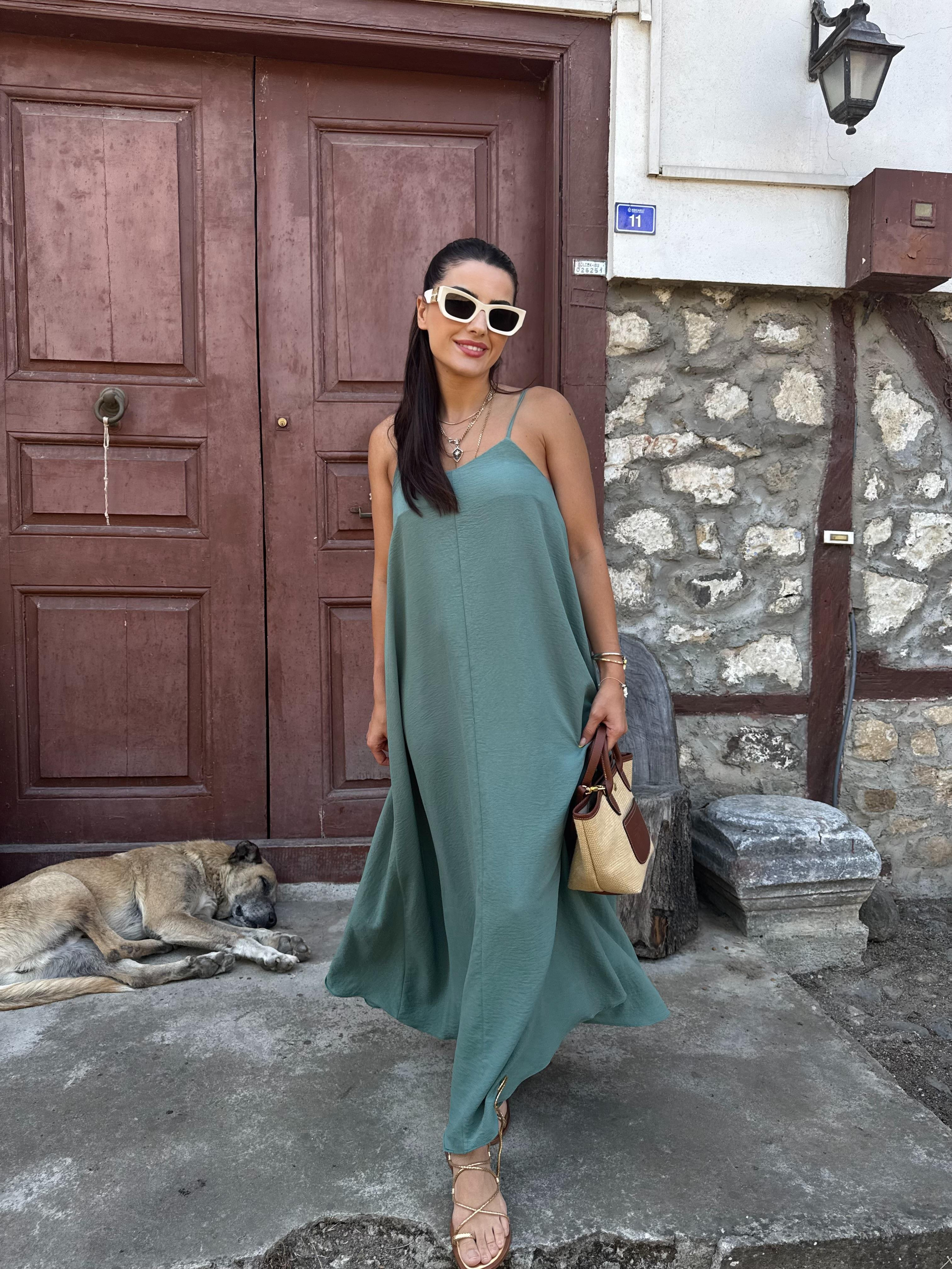 Mint Tensel Askılı Maxi Elbise