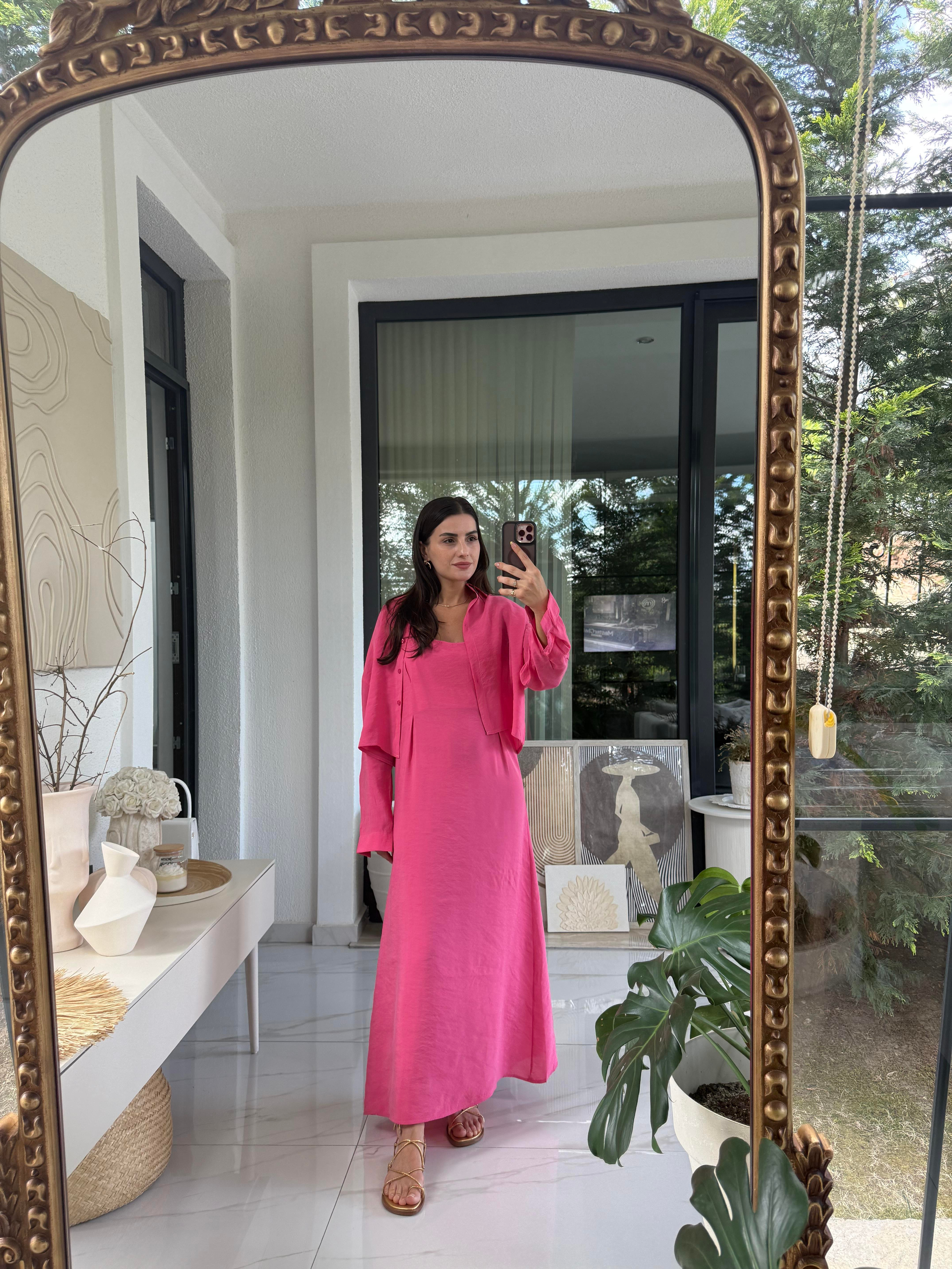 Pembe Askılı Elbise Crop Gömlek Takım