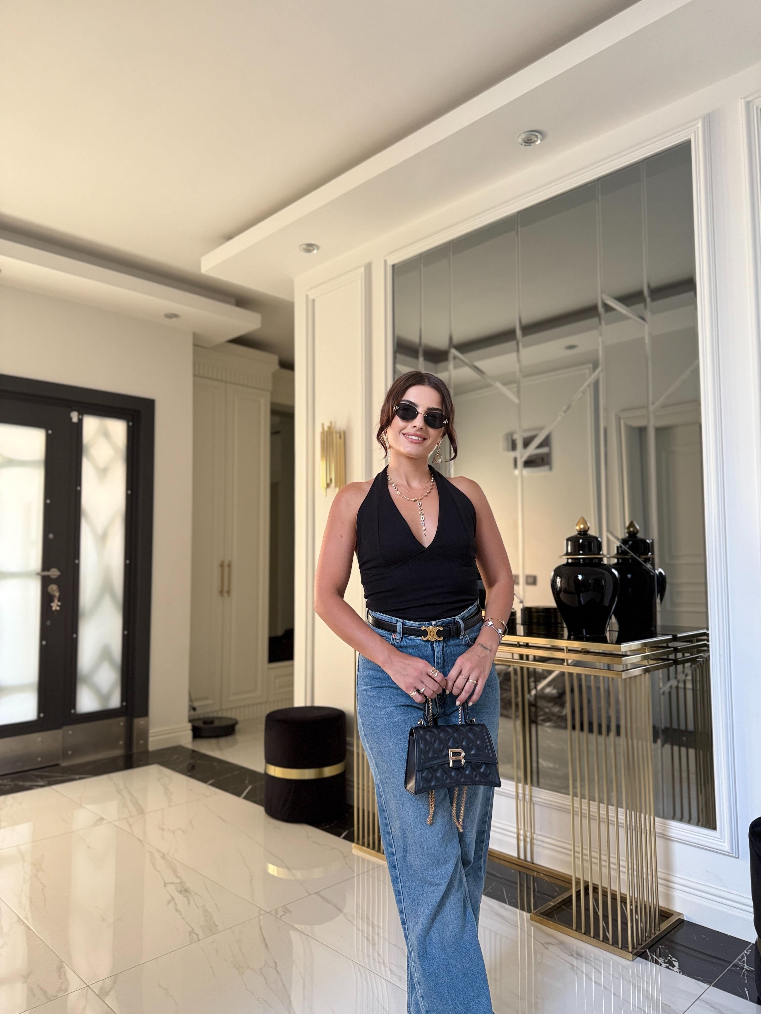 Siyah Boyundan Geçmeli Pamuklu Sırt Dekolteli Bluz