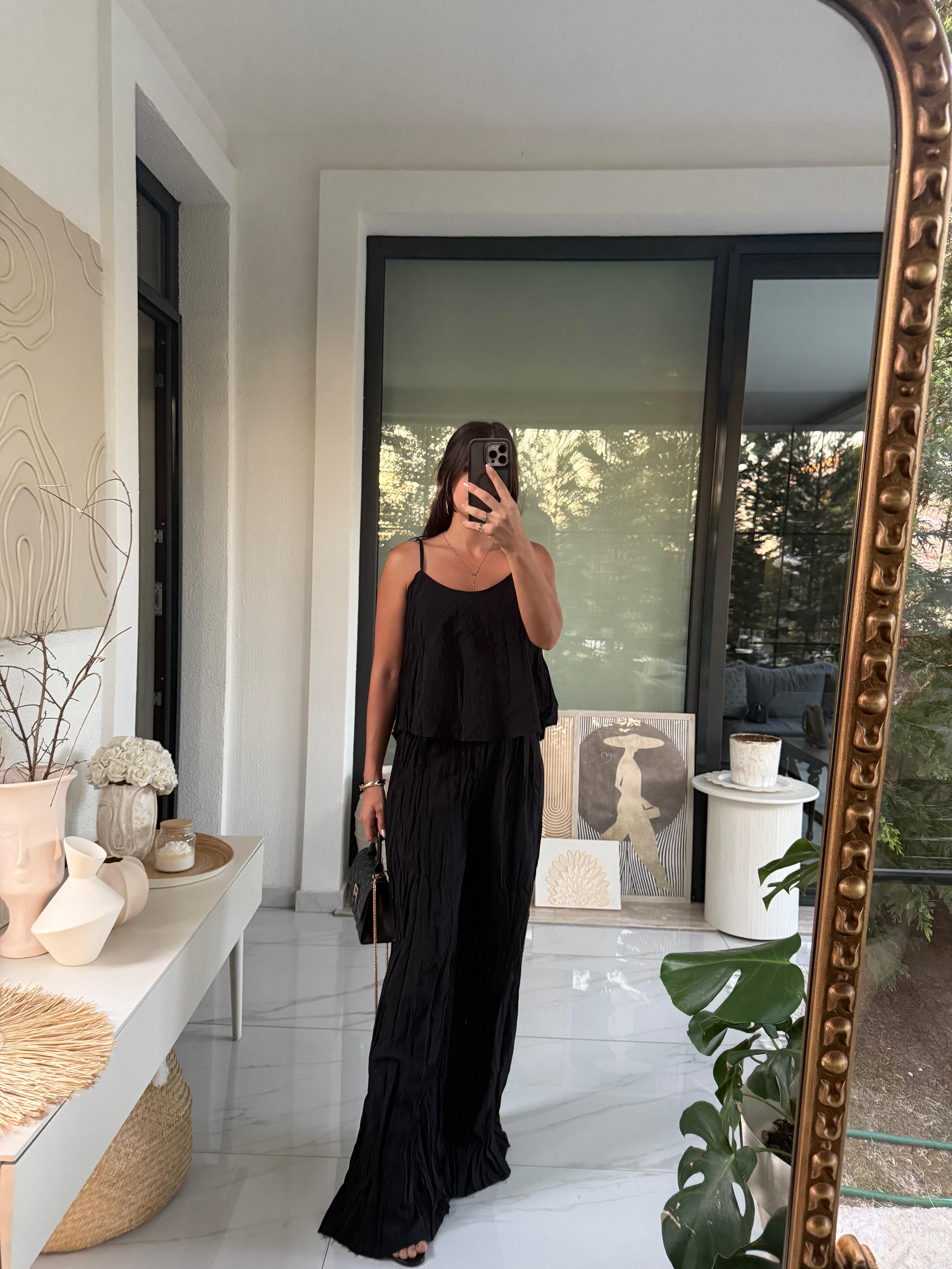 Siyah Kırışık Askılı Bluz ve Pantolon Takım